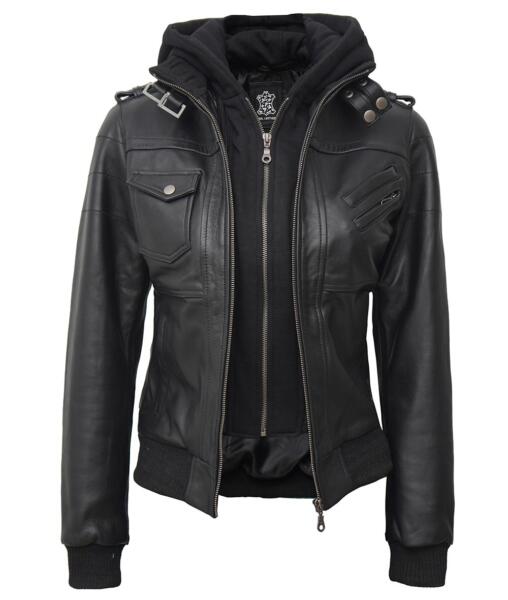 Womens Black Leather Bomber Jacket With Removable Hooded